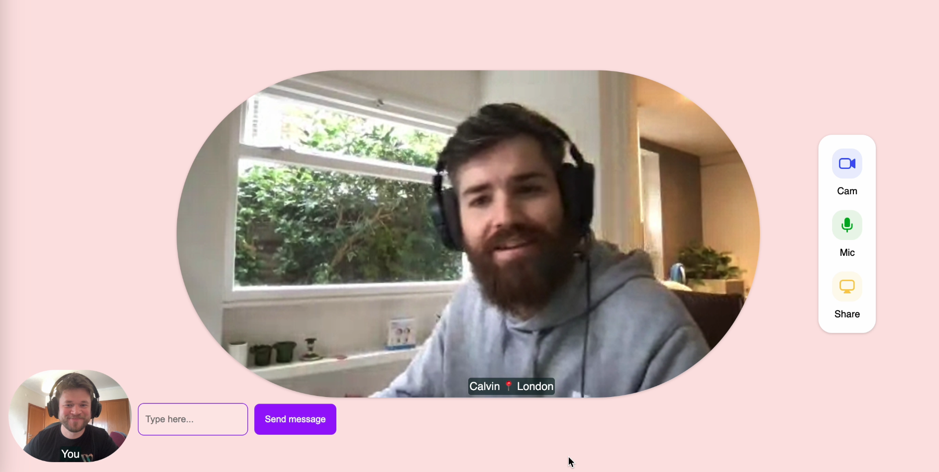 You can now see all the other participants in the room! Join the room from a separate browser, and you will see yourself twice - one small circle in the bottom left corner (The SDK self-view), and one big video. The big video represents the remote participant. If there are more people in the call, they will be displayed side-by-side.