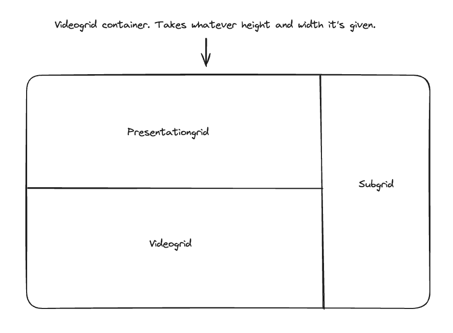 The placement of the grids will change depending on container size, number of presentations and number of participants in the video and subgrid. For example, if there are no active presentations, the video grid will fill the presentation space. The same rule applies to the subgrid.
