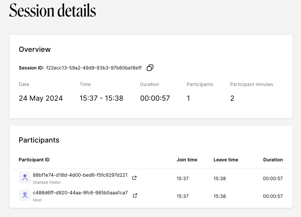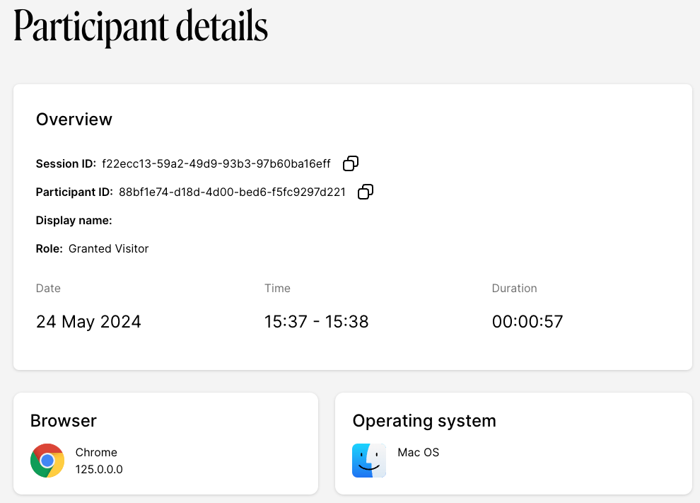 On the Session details page you can click on a Participant ID to see detailed information on that participant, including the externalId via the events section. You can also view quality related stats for that participant like any bandwidth, CPU issues, or packet loss. This can be a useful tool for troubleshooting if a participant reports issues during a specific meeting.
