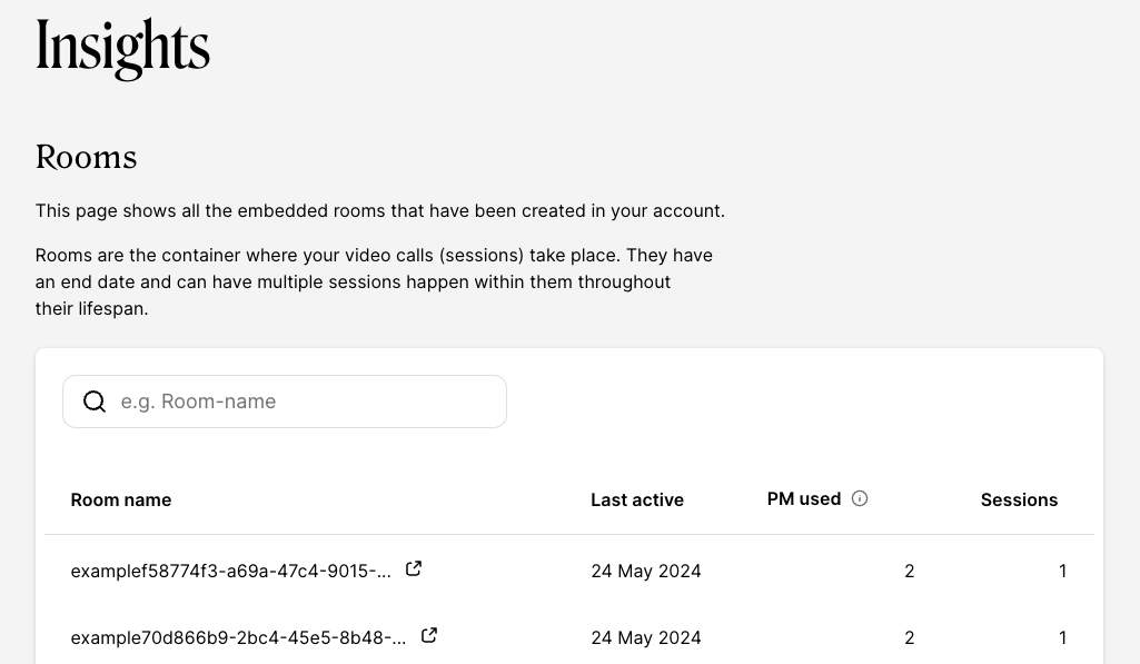 From here we can search for a specific roomNamePrefix to see a list of rooms that contain that prefix. The PM used column shows the number of Participant Minutes that have been used in that meeting, and the Sessions column shows how many sessions (individual meetings) have taken place in that room.