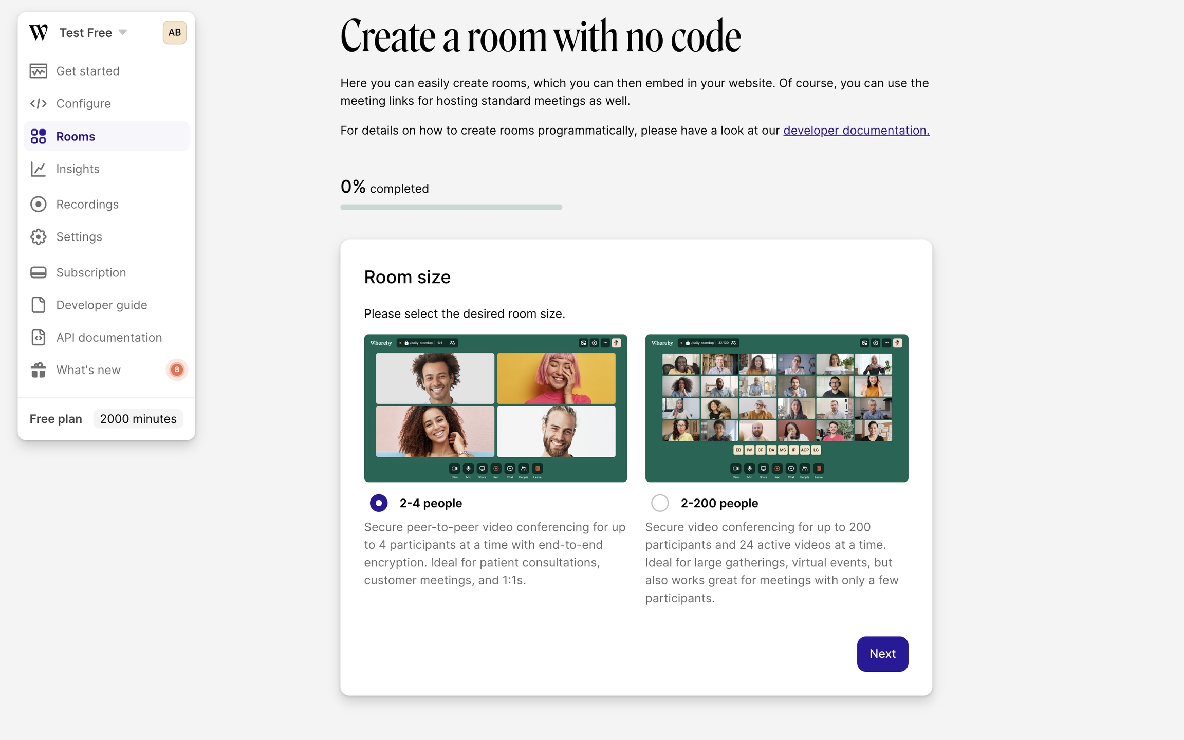 The fastest way to get started with creating Whereby Embedded rooms is through the “Create a room” flow, which can be launched from the “Get started” and “Rooms” sections in your Whereby Embedded account's Dashboard.